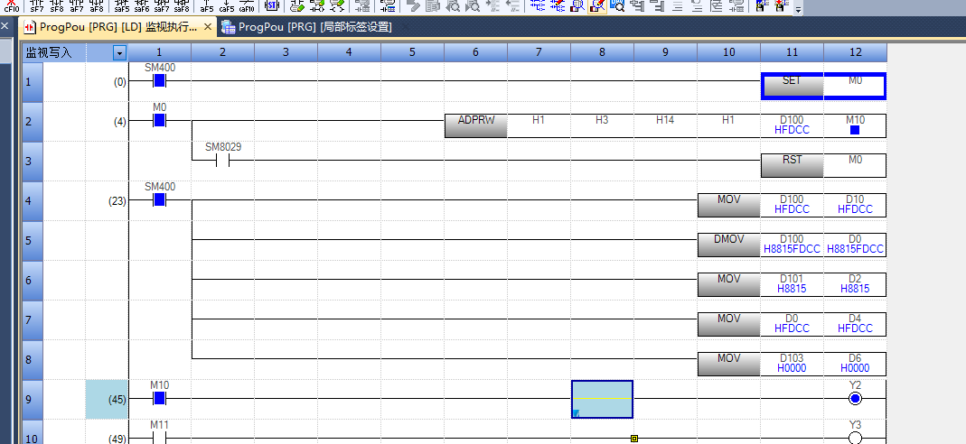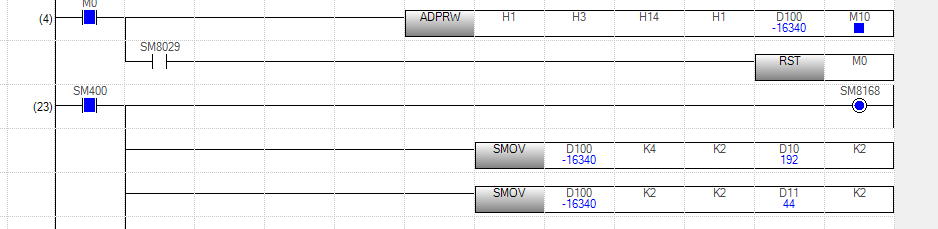 讀取的時候是連著用的四個寄存器ADPRW指令,數據存放到了D100,d101,d102,d103四個里面,