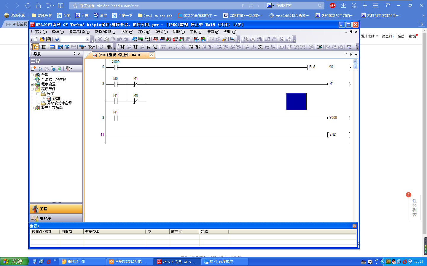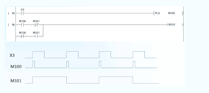 雖然知道脈沖型指令是一個掃描周期執行一次命令,但是如圖,在第三步的程序里有兩個m0中間繼電器,如果x0動作,在第三步里的第一個m0動作,第二個m0反不動作。我這樣理解正確嗎?ps:圖里的程序是x0控制y0輸出和停止