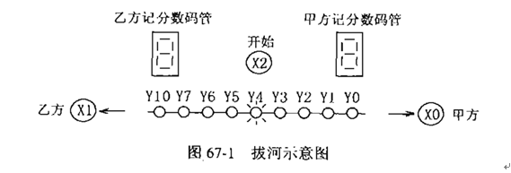 用9個(gè)燈排成一條直線,開(kāi)始時(shí),按下開(kāi)始按鈕,中間一個(gè)燈亮表示拔河繩子的中游戲的雙方各持一個(gè)按鈕,游戲開(kāi)始,雙方都快速不斷地按動(dòng)按鈕,每按一次按鈕,亮點(diǎn)向本方移動(dòng)一位。當(dāng)亮點(diǎn)移動(dòng)到本方的端點(diǎn)時(shí),這一方荻勝,并保持燈一直亮,并得一分,雙方的按鈕不再起作用。用兩個(gè)數(shù)碼管顯示雙方得分.