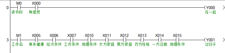 樓主,這五年有一個(gè)最重大的變化。可能你忽視了。 讀書的時(shí)候,喜歡誰,就去表白。都不用追 ,直接就表白,三個(gè)總能成一個(gè)。 雙方?jīng)Q定只需要一個(gè)條件,喜歡,或者不喜歡。 現(xiàn)在不是了。!,F(xiàn)在要的條件多了。。。 哎,我還是單獨(dú)發(fā)一個(gè)貼子吧。。 送你一個(gè)梯形圖 ![]() [ 此帖被Q02UCPU在2019-01-02 12:38重新編輯 ] |