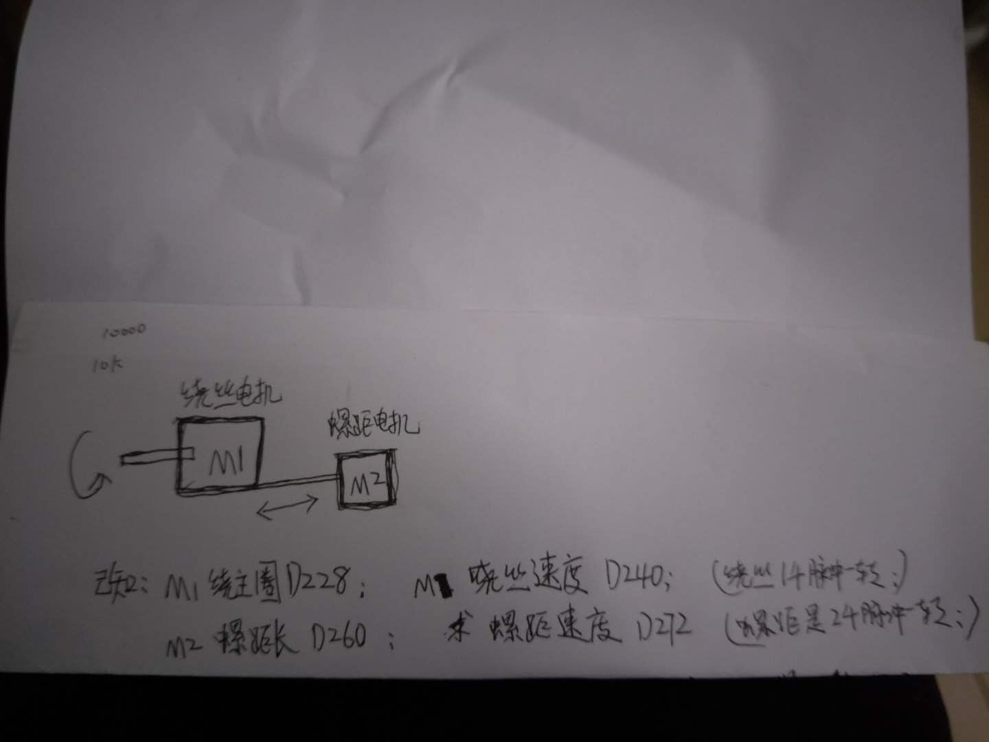 有兩個步進(jìn)M1是繞絲電機(jī)轉(zhuǎn)圈的,M2是左或移的剛好是螺距一樣。 M1.1000脈沖一轉(zhuǎn),繞圈數(shù)屏上設(shè)置(D228內(nèi))繞絲速度也在屏設(shè)(D240內(nèi)),