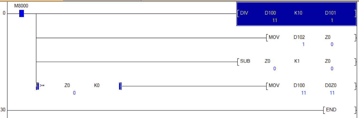 個位數有為0的情況 LD M8000 BCD D100 K1M0 MOV K1M0 Z0 MOV D100 D0Z0  |