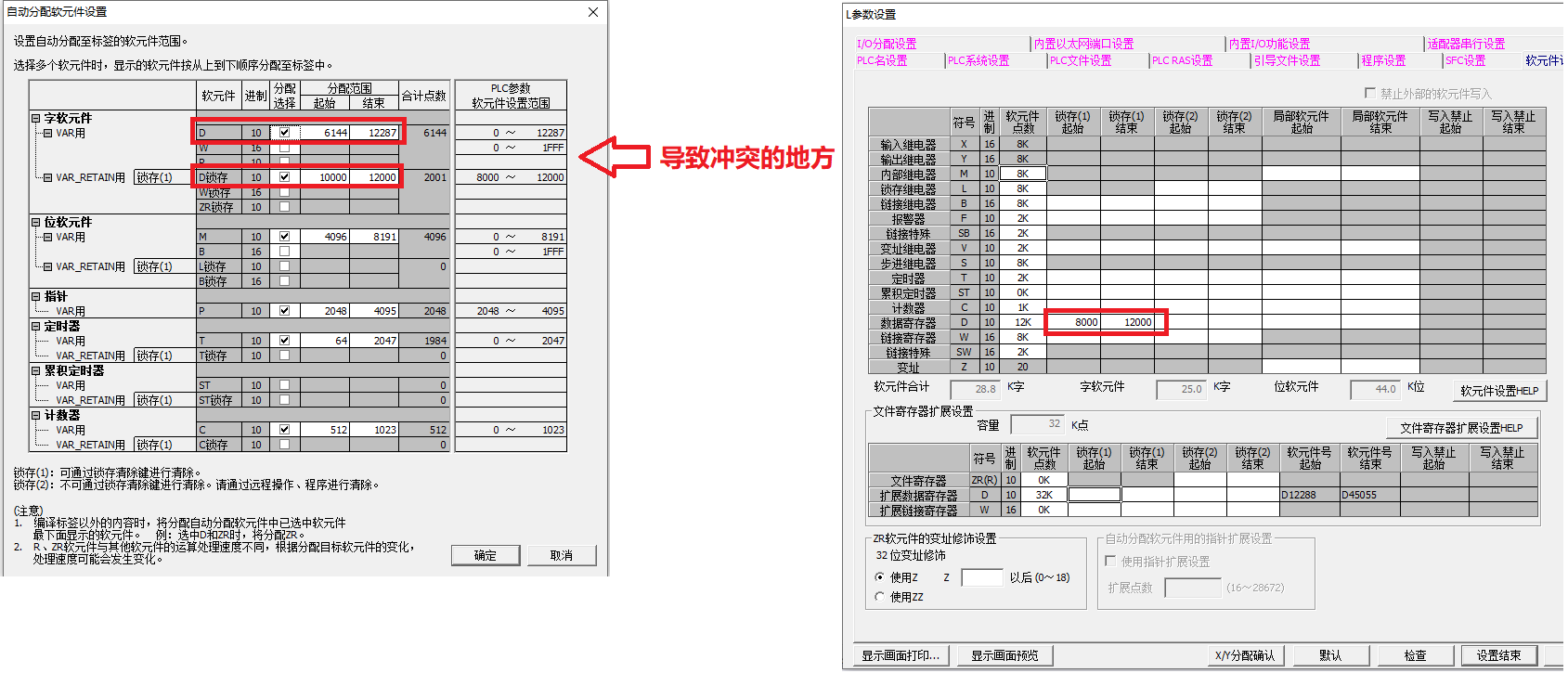 你在參數中設定了D8000-D12000為鎖存軟元件了,導致沖突,所以會報錯。