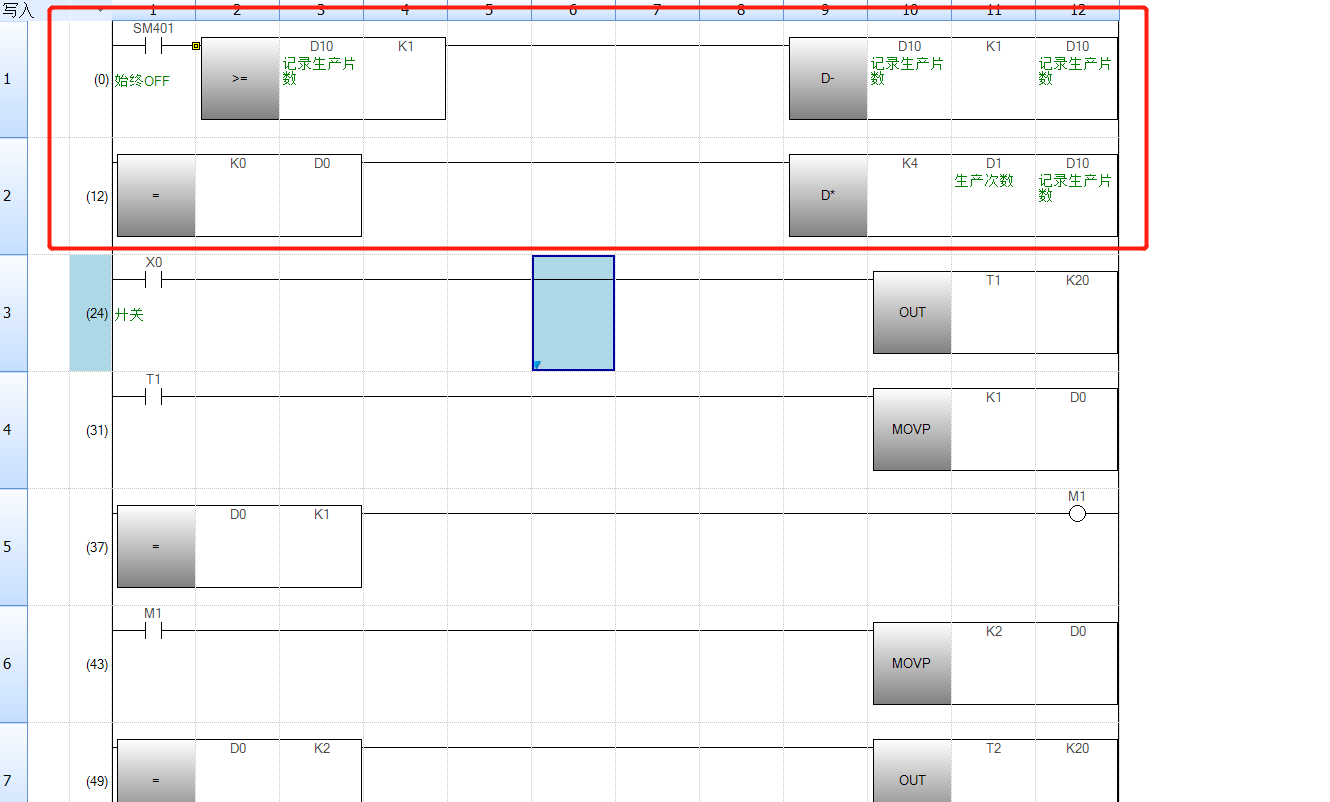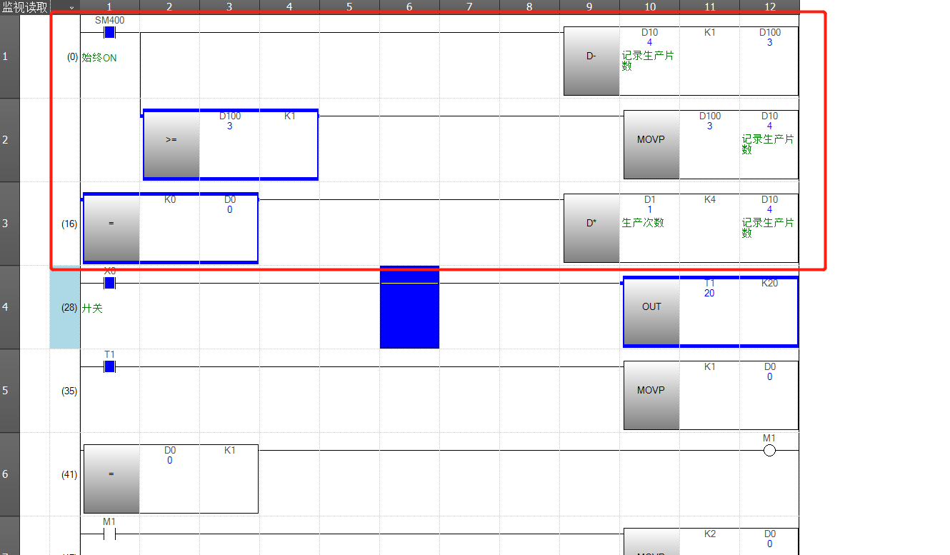 1.通過開關(guān)運(yùn)行,完成一個(gè)周期記錄+1(這時(shí)候+1數(shù)值寄存進(jìn)入D1),那么完成周期后會(huì)自動(dòng)把D1數(shù)據(jù)乘以4(這時(shí)候D1*4數(shù)值寄存進(jìn)入D10)