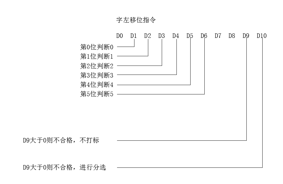 第一個(gè)寄存器,D0,D1……D11,哪一個(gè)工位不合格就置位,比如D1不合格,那么就D1,0等于1,第3工位不合格,那D2.1等于1,工位有沒(méi)有料靠M0到11來(lái)做,最后判斷的時(shí)候,D10大于0的時(shí)候,就是不合格……