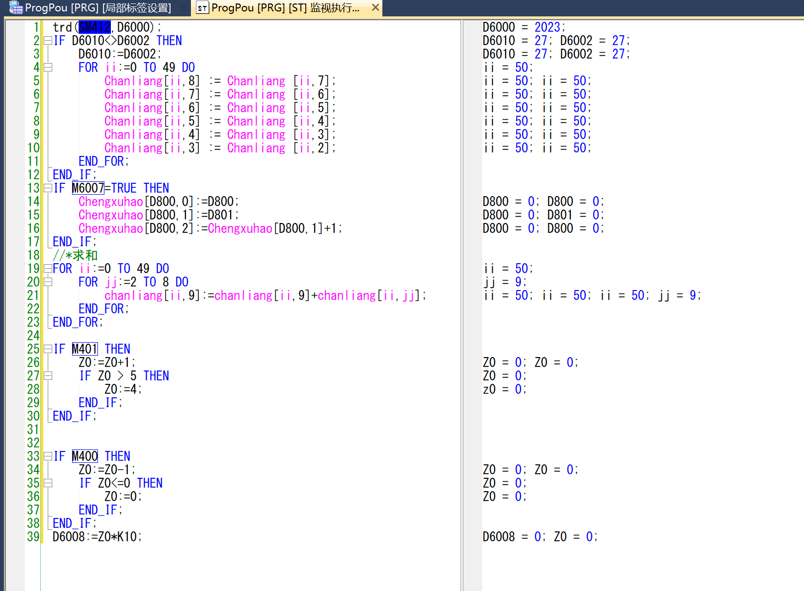 trd(SM412,D6000); IF D6010<>D6002 THEN D6010:=D6002; FOR ii:=0 TO 49 DO Chanliang(ii,8):=Chanliang(ii,7); Chanliang(ii,7):=Chanliang(ii,6); Chanliang(ii,6):=Chanliang(ii,5); Chanliang(ii,5):=Chanliang(ii,4); Chanliang(ii,4):=Chanliang(ii,3); Chanliang(ii,3):=Chanliang(ii,2); END_FOR ii; END_IF; IF M6007:=TRUE THEN Chengxuhao(D800,0):=D800; Chengxuhao(D800,1):=D801; Chengxuhao(D800,2):=Chengxuhao(D800,1)+1; END_IF; //*求和 FOR ii:=0 TO 49 DO FOR jj=2 TO 8 DO chanliang(ii,9):=chanliang(ii,9)+chanliang(ii,jj) END_FOR jj; END_FOR ii; IF M401 THEN Z0:=Z0+1 IF Z0>5 THEN Z0:=4 END_IF; END_IF; IF M400 THEN Z0:=Z0-1; IF Z0<=0 THEN Z0=0; END_IF; END_IF; D6008:=Z0*K10; |