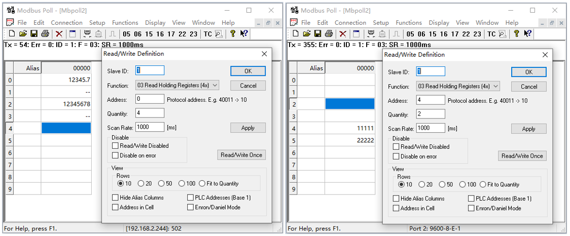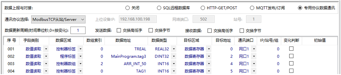本文是上位機通過Mobus協(xié)議緩存方式采用埃和智能網關IGT-DSER,讀寫羅克韋爾(AB)PLC的案例。 IGT-DSER智能網關是一款不用編程即可實現(xiàn)PLC設備對接SQL數(shù)據(jù)庫、MES等系統(tǒng)平臺的設備,同時也支持將PLC原廠協(xié)議轉為Mobus協(xié)議,支持ModbusTCP(網絡通訊)和ModbusRTU(串口通訊)的從站。 ![]() 上圖中序號001是PLC內名稱為‘TREAL’的REAL類型的控制器標簽,對應到Modbus地址的HR0(400001); 序號002是PLC內程序名稱為‘MainProgram’的DINT類型的程序標簽,標簽名稱為‘tag3’,對應到Modbus地址的HR2(400003); 序號003是名稱為‘ARR_INT_50’的INT類型的控制器標簽數(shù)組,取該數(shù)組中的第2個INT,對應到Modbus地址的HR4(400005); 序號004是PLC內名稱為‘TAG1’的INT類型的控制器標簽,對應到Modbus地址的HR5(400006); 參數(shù)設置完成后下載重啟后,即可通過上位機主站軟件進行測試,以下是通過Modbus Poll的軟件測試設置和測試的截圖: ![]() 相關資料軟件手冊案列: PLC設備數(shù)據(jù)采集與協(xié)議轉換.rar (4790 K) 下载次数:66 |