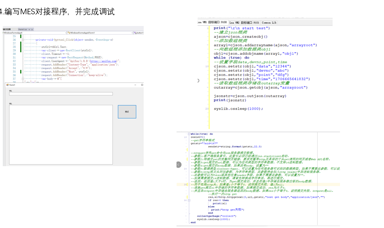 現(xiàn)在就說(shuō)一下接觸到的MES數(shù)據(jù)對(duì)接的大概流程。 1.和客戶確認(rèn)MES的接口,大部分是webapi,http。需要客戶提供URL地址(也就是MES服務(wù)器地址,一個(gè)網(wǎng)頁(yè)地址),Header(也就是標(biāo)頭,有些會(huì)和URL地址寫(xiě)一起),Content-Type(數(shù)據(jù)格式,大部分是 application/json),已經(jīng)請(qǐng)求的主題內(nèi)容,具體的每個(gè)客戶不一樣; 2.根據(jù)方案和需求選擇采用什么硬件做中間的客戶端,比如電腦+C#語(yǔ)言自己開(kāi)發(fā)、電腦+SCADA組態(tài)軟件、邊緣網(wǎng)關(guān)、采集盒子,具體看項(xiàng)目而定。 3.與PLC工程師對(duì)接數(shù)據(jù)地址,和數(shù)據(jù)格式,并完成與PLC交互測(cè)試。 4.編寫(xiě)MES對(duì)接程序,現(xiàn)場(chǎng)項(xiàng)目調(diào)試。 主要使用1.電腦+上位機(jī)語(yǔ)言(C#) 2.電腦+SCADA軟件(幾個(gè)知名的組態(tài)軟件都支持,品牌就不提了) 3.邊緣網(wǎng)關(guān)、組態(tài)盒子(品牌就不提了,有廣告嫌疑) 4.HMI觸摸屏(有部分觸摸屏有這個(gè)功能,但是都不夠靈活,)。 主體控制思路是 上位機(jī)開(kāi)啟兩個(gè)客戶端,一個(gè)對(duì)接PLC,一個(gè)對(duì)接MES系統(tǒng)。不停的讀取PLC的觸發(fā)信號(hào)線圈或者寄存器,條件滿足,則讀取預(yù)設(shè)的數(shù)據(jù)寄存器,并打包成需要上傳的格式,上傳至MES服務(wù)器。 以上只是常規(guī)的PLC與MES對(duì)接一種方法。其他還有MES主動(dòng)來(lái)讀取數(shù)據(jù)(比如WEBSOCKET等)、MQTT、以及PLC的MES模塊擴(kuò)展等。 帶小案例介紹 https://mp.weixin.qq.com/s/kR1Y5Hkh3VBpTNMs0EAVbw |