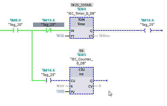 創建此類自復位定時器時,請勿將定時器DB 結構的“Q”成員用作該定時器指令前面常閉觸點的參數。而是要使用與該定時器指令的“Q”輸出相連的變量。如果訪問定時器DB 結構的Q 成員,將導致定時器更新,且如果因常閉觸點而更新定時器,該觸點將立即復位該定時器。定時器指令的Q 輸出將在一個掃描周期內不為ON,并且依賴型網絡不會執行。