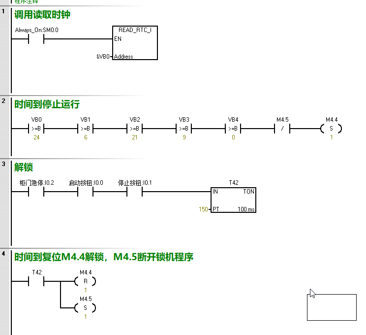 為了好要尾款,寫這個停機程序可以實現嗎?調用時鐘庫指令,設定24年6月21日9點時間到,置位斷電保持寄存器M4.4為ON,停止運行,解鎖程序是按下急停,啟動和停止按鈕同時按下15s后斷開鎖機程序,復位M4.4,系統可以重新啟動。這樣寫可以嗎?目前PLC是200smart的,,因為客戶可能平常下班會拉閘,拉閘是不是內部時鐘就不跑了,是不是需要買一個288-5BA01的時鐘卡來實時計時。。如果客戶拔下時鐘卡來,這個程序是不是也沒有用?還有就是解鎖置位M4.5,以后這個狀態位會一直保持斷開嗎?我設置了斷電保持,萬一不置位了,設備是不是又會停機。謝謝大家