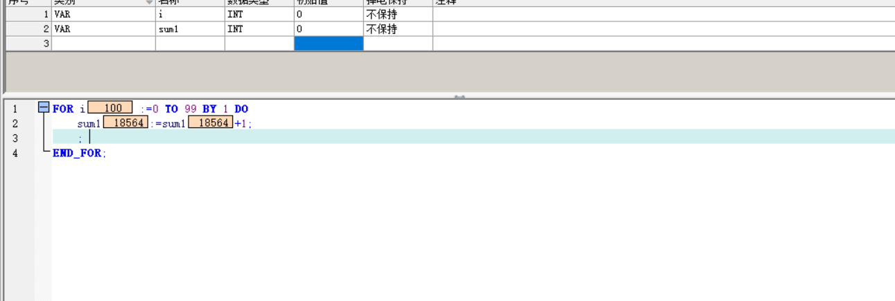 每個掃描周期都會給 sum1 增加 100(執行 100 次 sum1:=sum1+1) ,i跟sum1有什么關系 你要是只在循環那應該是Sum1=i+1 用那個循環的i,而不是sum1加呀,sum1等于是這個程序塊的全局變量, 樓主留言:嗯嗯謝謝 |