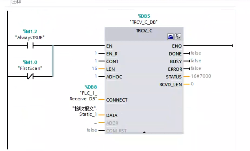 在線監(jiān)視`TRCV`的`RCVD_LEN`和`STATUS`,正常時(shí)應(yīng)返回`16#7000`(無(wú)錯(cuò)誤)。