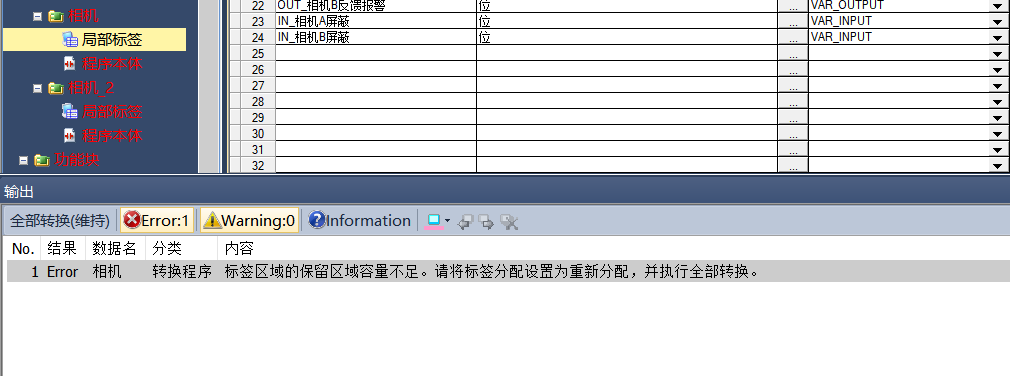 解決方法:工具-自動分配軟元件設置,分配更多的軟元件給自動分配區(注意自動分配的區間編程時不要人工調用或使用,也不要與斷電保持區間之類的重復)。或減少FB所使用的標簽。