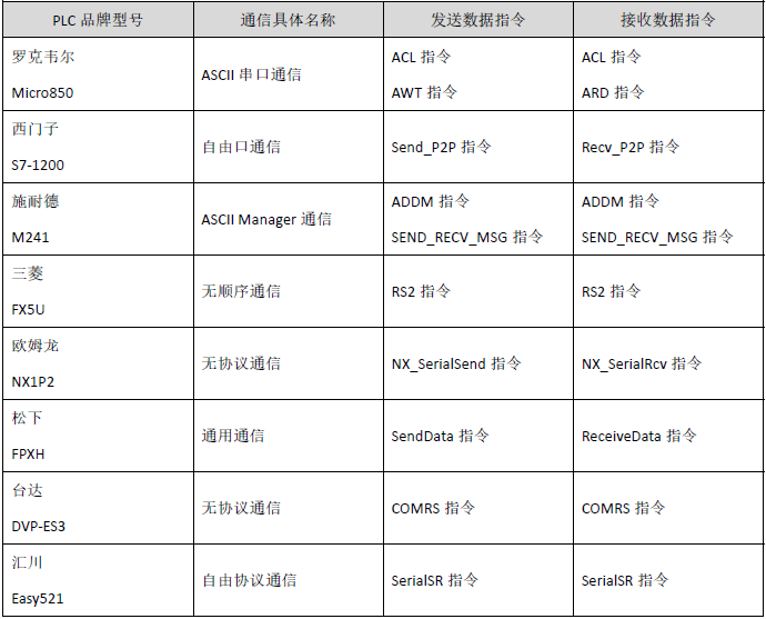 不同品牌PLC實現串口自由協議通信的名稱、發送數據使用指令和接收數據使用指令均有所不同,詳情如下表所示。