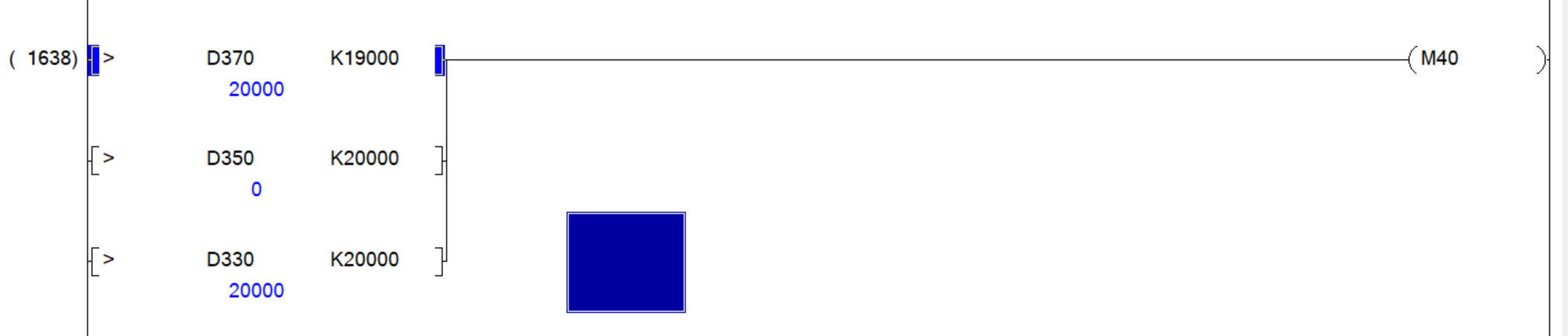 用到三菱PLCFX3U的,有D370,D350,D330三個寄存器,是面板上調節速度的,要求是這三個寄存器的參數不得高于19000,20000,20000.如果任何一個超過這個數,那么就報警,報警的線圈用M40,報警之后這三個數調節到小于或等于要求的這三個數值后M40解除報警。寫了兩種,監視著參數都不行,其他地方沒用用到M40,只有這里用了,這里要么到斷開條件不斷開,要么到接通條件不接通,這是那里沒寫好。