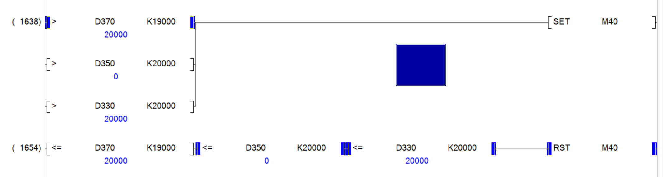 [attachment=315893]  [attachment=315892] 用到三菱PLCFX3U的,有D370,D350,D330三個寄存器,是面板上調節速度的,要求是這三個寄存器的參數不得高于19000,20000,20000.如果任何一個超過這個數,那么就報警,報警的線圈用M40,報警之后這三個數調節到小于或等于要求的這三個數值后M40解除報警。寫了兩種,監視著參數都不行,其他地方沒用用到M40,只有這里用了,這里要么到斷開條件不斷開,要么到接通條件不接通,這是那里沒寫好。