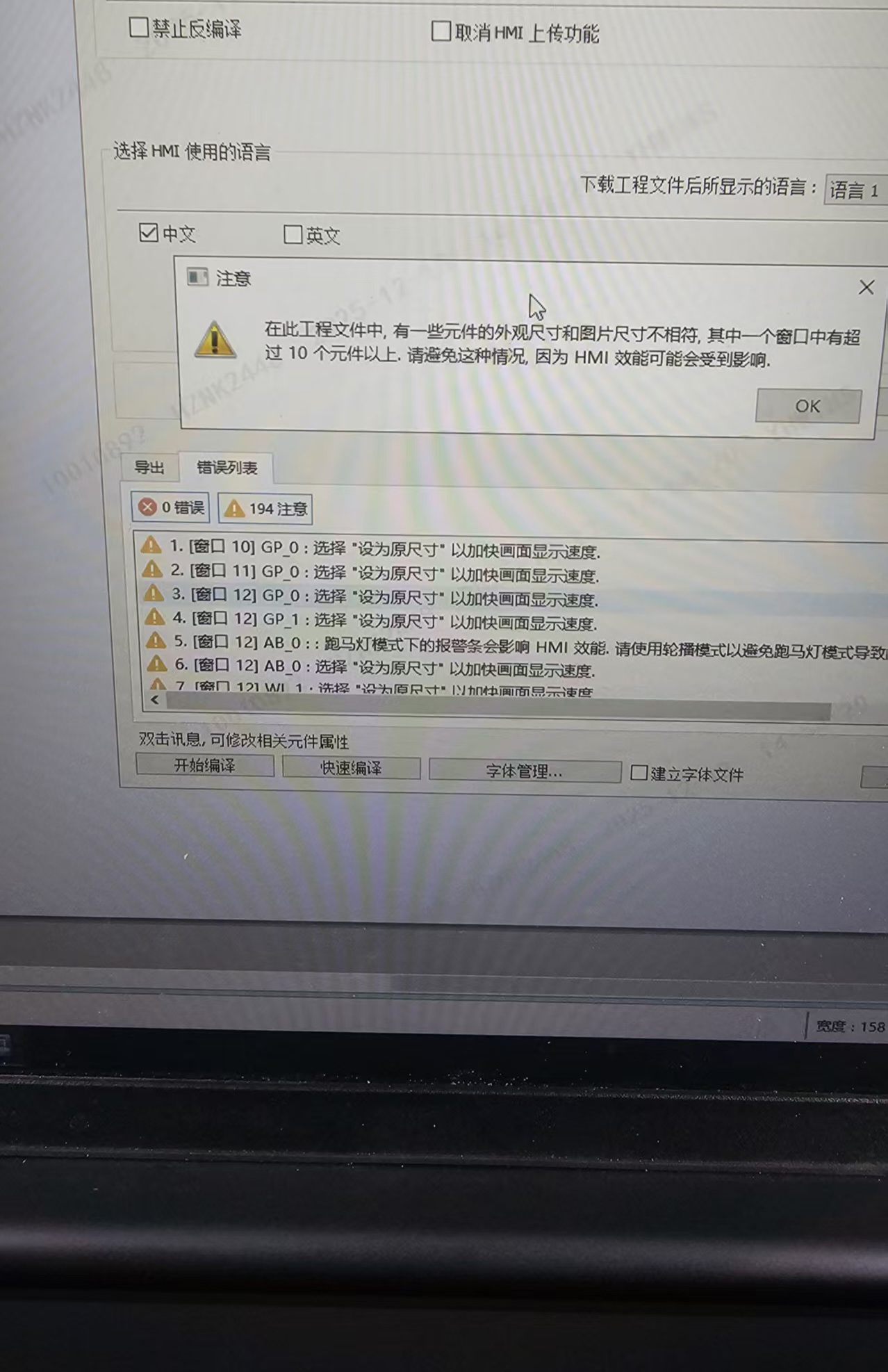 原尺寸那個,我之前好像遇到過,應該是你放大或者縮小圖片了,這個警告項不影響編譯,至于你說的那個刷新速度慢,看屏和plc的通訊格式是否一致吧,,如果不是這個問題那就可能是你程序的問題了