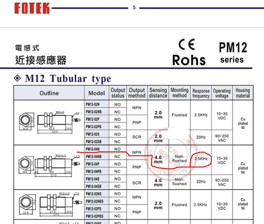 求助,需要一款DC24V接近開關,直徑M12,非埋入式,檢測距離4毫米,NPN常開,脈沖頻率800HZ以上,抗干擾能力強。