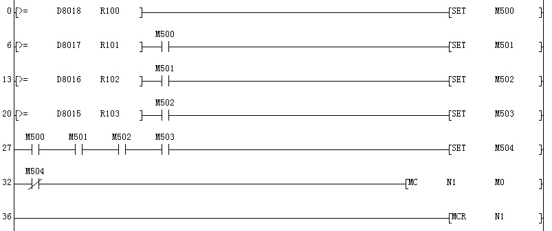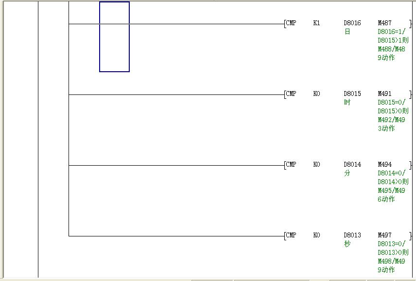 年月日時(D8018,D8017,D8016,D8015)都到設(shè)定值時,M504就會置位(這是個保持繼電器)。 寫在MC和MCR之間的程序就會停止工作。這是FX3U的程序,把R寄存器換成D寄存器就可用在FX2N等PLC上了... 把M500-M504復(fù)位后程序就可工作... ![]() |