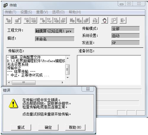 今天使用Proface編程軟件傳輸畫面的時候,在傳輸窗口里面的傳輸狀態里顯示protocol/gpsteupe.cfg無法設置系統,傳輸中止,如下圖,我的操作系統是Windows Vista Home Basic,請各位高手幫小弟分析一下是什么原因?是軟件與我的操作系統不兼容還是有別的原因?謝謝各位。