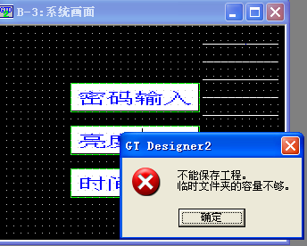 請教:我用三菱界面軟件GT Designer2編輯時,編輯好后想進行文件保存,可是卻提示:軟件GT Designer2提示"臨時文件夾容量不夠,不能保存工程",這是什么原因,是不是版本問題呢"還是沒注冊的原因?急........