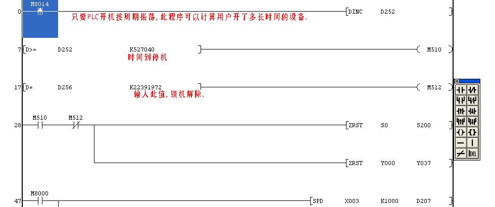 要點(diǎn)在屏上,FX2NPLC里面可以不做程序,屏里可以直接驅(qū)動(dòng)FX2N輸出禁止繼電器.只要時(shí)間到屏上可以打出故障提示.