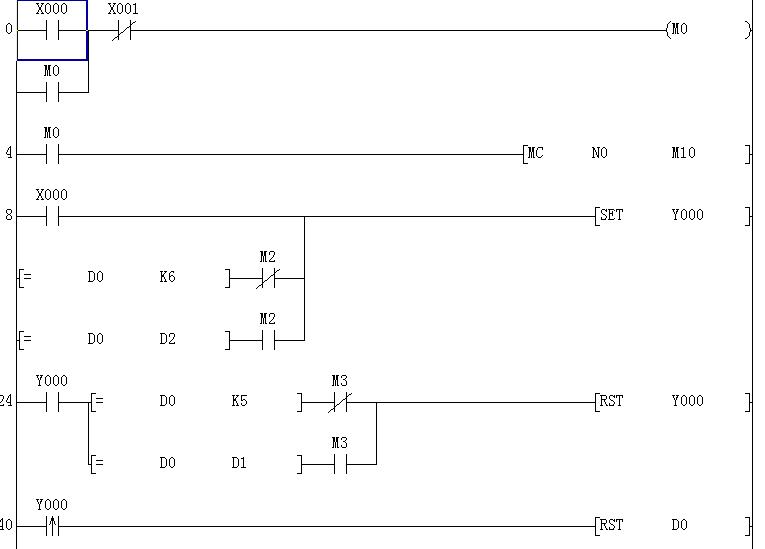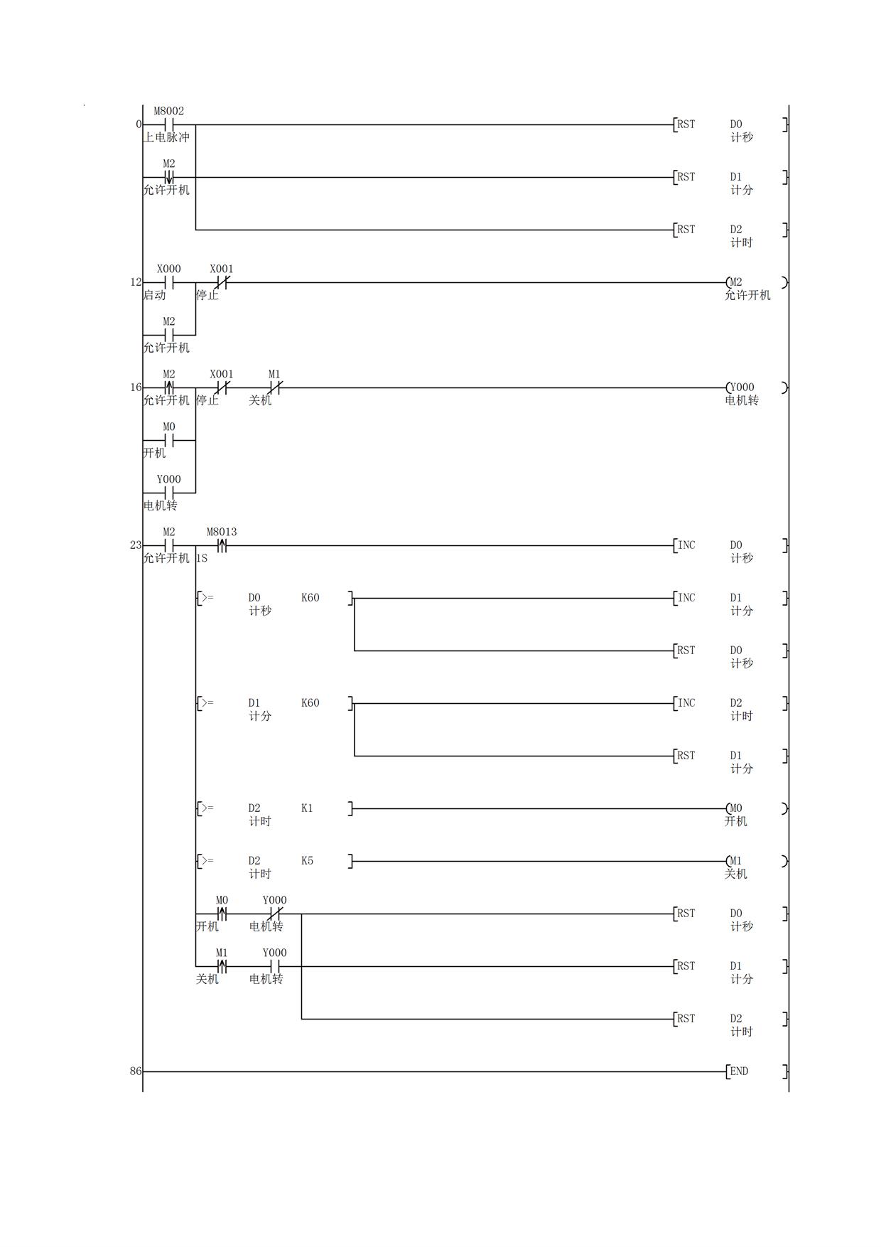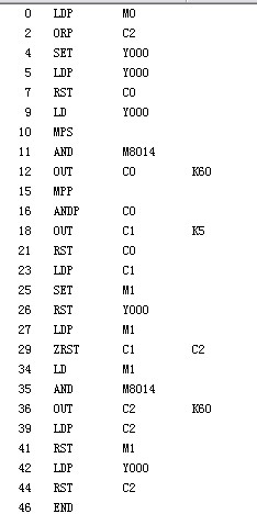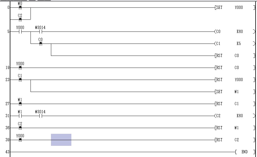 為了便于模擬,圖中本應使用M8014,改成M8013,次數也改短了,另外M2和M3是自己調整時間后的確認按鈕(置ON型),用瞬ON也可,再加幾個輔助繼電器。