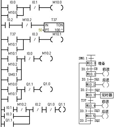 (2)小車后退碰到限位開關SQ2后,小車電機M停轉。停5s后,第二次前進,碰到限位開關SQ3,再次后退。