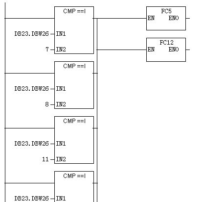 當(dāng)DB23.DBW26=7或8或11或…時調(diào)用功能FC5和FC12 。