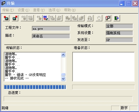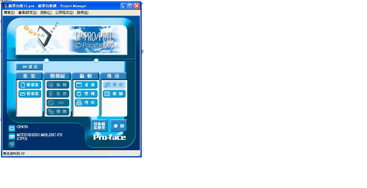 空的也可以下載,但一般你可以規劃個按鈕跟指示燈這就是最基本的看是否正常,沒有也沒關係,傳輸埠要用插在tool埠,就那一個跟三菱fx系列傳輸不一樣的那一個8 pin din接頭,但傳輸線可能無法自製或用其他的替代一定要用proface自己的傳輸線.有的型號直接就可傳輸有的就要跳入人機本身的系統畫面才開始做傳輸.