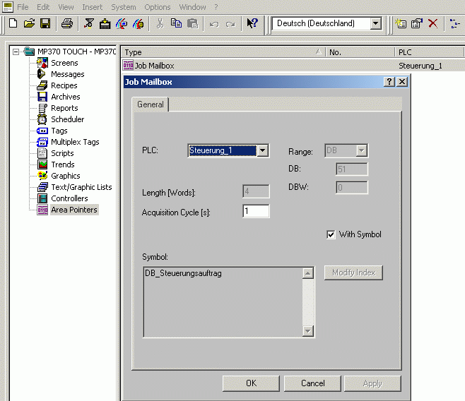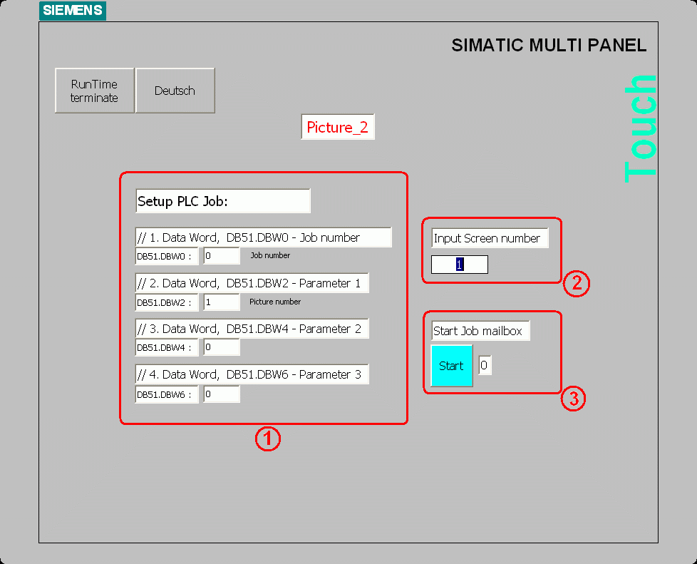 如何通過控制器作業51來控制基于 Windows 操作系統的操作面板的畫面切換? 創建區域指針: 在 ProTool 中創建“作業信箱”的區域指針。 預設長度為 4 個字。 圖 01PLC 作業的結構: 一個 PLC 作業包含 4 個數據字。第一個數據字包含作業號。根據所指定的作業號功能,最多可以在數據字 2 到 4 中傳入 3 個參數。下圖顯示了該數據結構。 ![]() 圖 02 51 號 PLC 作業結構: 圖 03關于區域指針及參數設置的詳細信息可以參閱 SIMATIC HMI 通訊手冊中的附錄 B ,“ PLC 作業”。 在條目號 1405528 中可以找到該手冊。 功能設置順序: 如果該作業信箱的第一個字不等于 0 ,操作員面板將執行 PLC 作業。之后操作員面板將把該字歸 0 。因此,必須在輸入作業信箱作業號之前輸入參數。 例程/組態說明: 注意: 在附件的例程中將使用區域指針指向 DB51.DBW0 ,長度為 4 個字。 * 通過控制器將希望調用的畫面編號輸入作業信箱的第二個數據字( DB51.DBW2 )。如果需要,還可以在作業信箱的第四個數據字 ( DB51.DBW6 ) 中輸入畫面中相應的域號。 * 在作業信箱中的第一個數據字 (DB51.DBW0) 中輸入作業號“ 51 ”。通過修改該值,操作面板將執行畫面切換,并切換到 PLC 作業中輸入的畫面編號相應的畫面。 * 一旦畫面切換完成,操作面板將會再一次將第一個數據字 (DB51.DBW0) 寫入 0 。 注意: 一個 PLC 作業一定不能連續調用。一個 PLC 作業通常不能引用長于兩個 PLC 周期。 程序描述: 為了更好的體會 PLC 作業 51 的功能,可以在例程中指定“畫面編號”然后通過一個按鈕來開始 PLC 作業。 通常, PLC 作業的開始及“畫面編號”的設置是由 PLC 程序來完成的。 畫面區域“ 1 ”: 畫面區域“ 1 ”再一次顯示了 PLC 作業的參數結構。 畫面區域“ 2 ”: 在畫面區域“ 2 ”中可以輸入將要調用的畫面編號。 ( 在第二個數據字中將會顯示畫面編號 -> Parameter 1 )。 畫面區域“ 3 ”: 通過點擊畫面區域“ 3 ”中的“開始”按鈕開始執行作業。 (按下“開始”按鈕后, PLC 作業號“ 51 ”將會短暫的顯示在第一個數據字中 -> Job number )。 圖 04 |