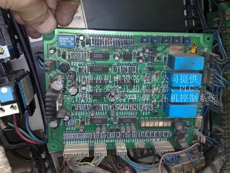 前幾天,一東莞長安空壓機維修同行電話聯系,要求我們提供技術支持,我們第一時間前往現場處理。到達現場,該空壓機為復盛FS-007,04年產。使用已經近10年了。機器看起來還不錯。該機器故障為經常不加載,故障不穩定,隨機性。根據這樣的故障現象,同行已經在加載閥上安裝上一個信號燈,加載閥動作時,指示燈亮,看來同行也檢查過了。打上電源,啟動空壓機,空壓機星三角轉換正常,此時按時間推算,應該進入加載狀態,但是加載閥上面的指示燈一直沒有亮,那證明機器壓縮系統沒有加入加載狀態。切斷電源,打開電氣箱。把控制板上面的鐵皮外罩拆下。路出控制電路板,改控制電路板上面有4個LED指示燈,通過查看電路走線。4個LED燈分別和4個繼電器并聯,通過繼電器分別控制電機主交流接觸器,星型運行交流接觸器,三角運行交流接觸器,和加載閥。那么,就是說4個LED燈分別指示上面4個負載。基本電路已經摸清。空壓機再次上電,開機,進入加載時間段。過程中。4個LED都指示均符合實際工作流程,此時,指示加載的LED指示亮也亮。表示電路板功能部分有輸出加載的信號,但是加載電磁閥沒有動作,掛在加載電磁閥上面的指示等也沒有亮。根據上面的情況,基本鎖定時負載加載電磁閥的繼電器有問題。把繼電器拆下,把繼電器的外殼剝掉。可見,繼電器的觸點已經被電流腐蝕。重新更換繼電器。再次試機。機器加載正常,重復多次,加載動作符合實際要求,為了避免繼電器再次損壞,我們再電磁閥線圈線路上增加突波吸收器,避免電磁閥線圈在通斷電時產生的反向電動勢對繼電器觸頭發電,繼而腐蝕繼電器觸頭。機器維修完成。