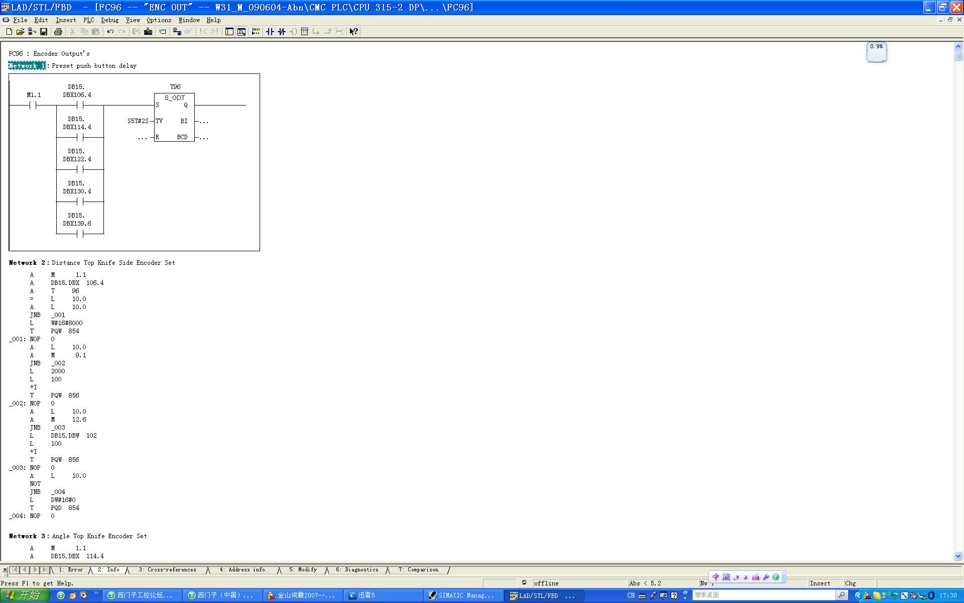 有一個問題,不知大家碰到過沒有,就是一個S7程序,在外方(德國)編程器下顯示為梯形圖,但是同樣程序裝到我電腦里后顯示時只能部分轉化為梯形圖,還有一部分顯示為語句表,所有設置都和他的編程器顯示是一樣的,我也把電腦操作系統安裝為英文了,顯示還是一樣,請教高手指點,謝謝!!!