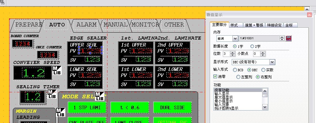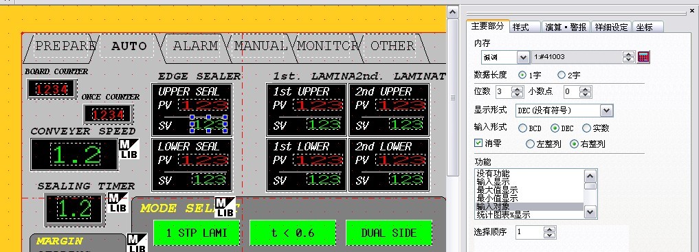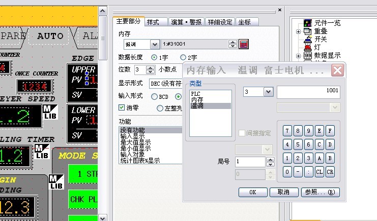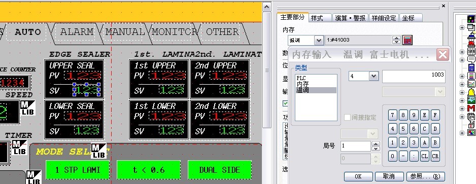 本公司的設備中,用的觸摸屏是富士的UG330 溫控器是富士的PRX4 ,利用PID來控制加熱器的溫度。在觸摸屏中,PV、 SV區域分別用來讀取溫度值、設定溫度值的。利用RS485進行通信。