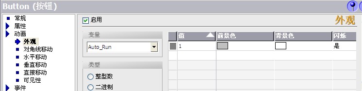 小弟用wincc flexible 2008 編寫觸摸屏程序,其中設置自動和手動控制切換按鈕在各自工作狀態下為閃爍,以便在功能設置時觀察到時處在何種工作狀態下,其中手動,自動切換變量為M2.0,當M2.0為0的時候處于自動控制,自動控制按鈕里的動畫設置為閃爍;