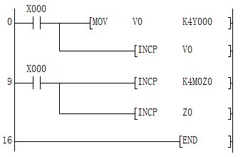 設開始時,M0~M15均是斷開的,即K4M0的內容為0,則在(Z0)=0時執行一次加1操作后,K4M0的內容為0+1=1,所以M0為1、即M0接通。