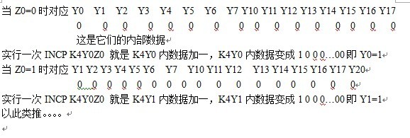 同樣地,INCP K4M0Z0,將K4M0Z0看成一個(由位元件組成的)數據寄存器,執行一次該條指令,則K4M0Z0的內容加1。