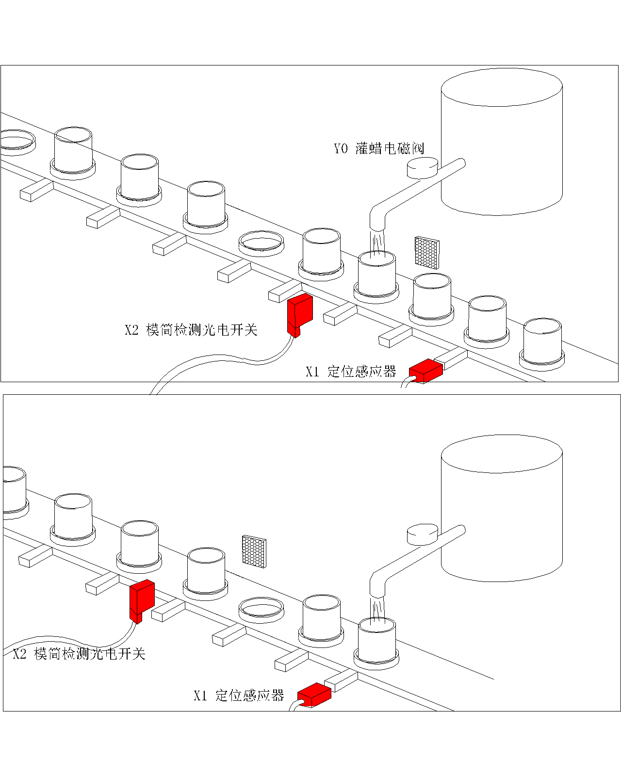 如圖,我原來我把感應器就裝在灌注的哪個工位位置,開始是可以的,但是蠟水灌進去的時候會濺射出來,還會溢出來,會把光電感應器的孔塞住,那樣的話就不起作用了,這樣的話有沒有模具筒在那里都會灌蠟。