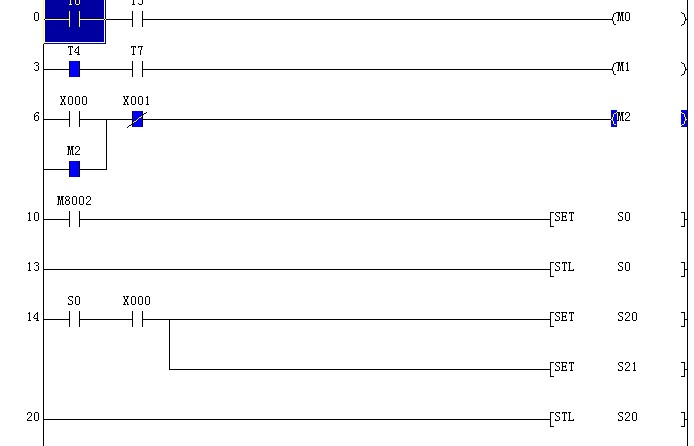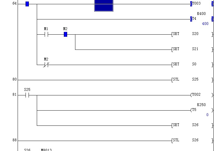這是我自己編的步進控制(用的并聯性分支)十字路口紅路燈的梯形圖,我本意為M0接通后同時讓S24.S25同時接通,但現在只接通S24,這是那里編錯了啊??