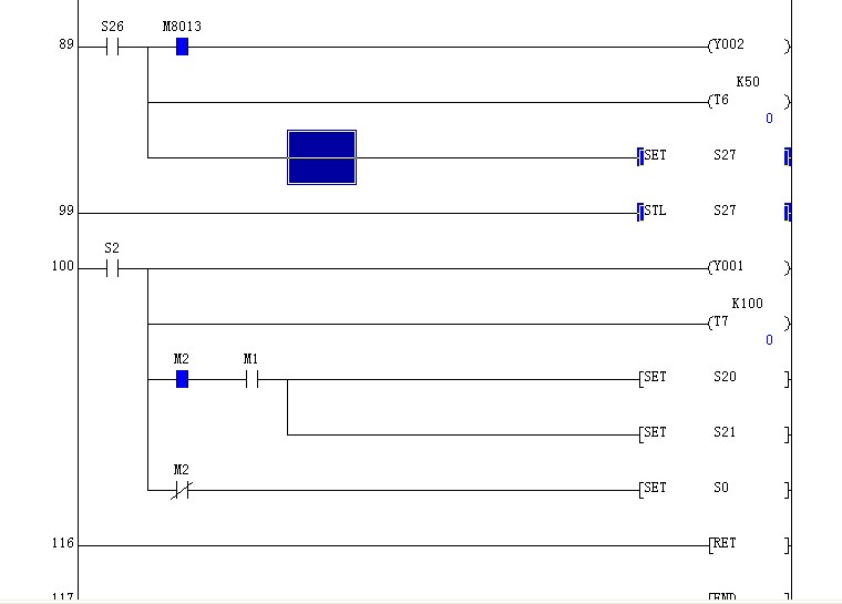 5樓的哥們,,你仔細的看,其實SET S26,SET s27,,在他們前面都有時間繼電器,,只要SET S26前面加一個T5的常開觸點,SET S27前面加一個T6的常開觸點,問題就沒有了