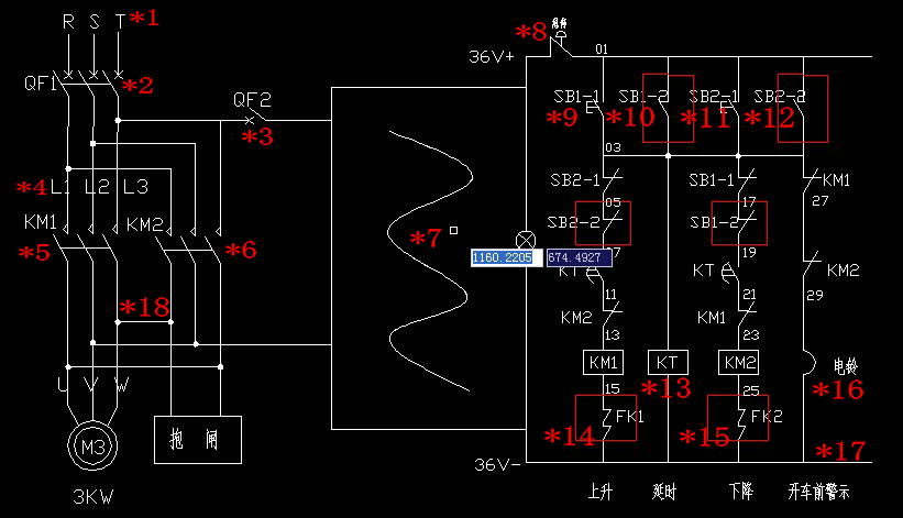 這只是個簡單畫的380V~36V的變壓器(圖畫的不是很標準),紅色框內的是現場同樣控制的按鈕