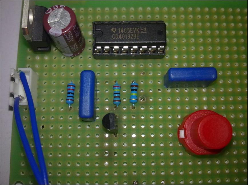 板子上的元器件:7812、一個(gè)極性電容(濾波)和兩個(gè)非極性電容(0.1uF)、IC(40192)、2K電阻、10K電阻、100K電阻各一個(gè),一個(gè)三極管、一個(gè)按鈕。