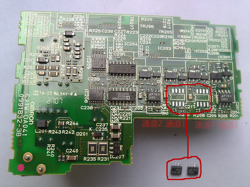 分析電路,此4路電流輸出分別使用了4個集成塊LT1490進行D/A轉換,先測量1、4通道上集成塊LT1490上的外部元件,三極管、電阻均沒有發現問題,懷疑第1、4通道上的集成塊LT1490損壞,因手上沒有備件,試采用對調的方法判斷,將1通道上的集成塊LT1490換到2通道,2通道的集成塊LT1490換到1通道,結果,1通道電流輸出正常,2通道沒有電流輸出,從而判斷1通道是集成塊LT1490故障,用同樣的方法,判斷4通道也是LT1490損壞,新購買2個LT1490,更換,故障排除。