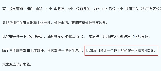 比如需要按一下啟動按鈕后,油缸往復動作4次后復位。  或者按下啟動按鈕油缸往復10次后復位。 不是說設計一個可動四次,或者可動10次的。是說可以設計成動10次,或者動4次,或者哪怕100次,隨意設計往復次數的意思是這個。
