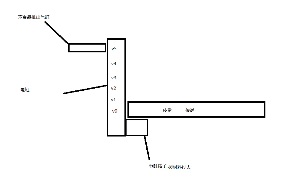 如題目.......程序思路現在是這樣的:電缸6個位置,v0一般是空位.v1234是堆積材料的位置.v5是判斷位置.氣缸推出不良品