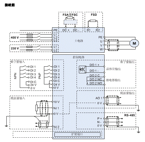 通過(guò)變頻器內(nèi)參數(shù)調(diào)整,可以對(duì)DI1--DI4端口進(jìn)行設(shè)置,分別為正反轉(zhuǎn)及固定頻率,接線圖如下圖所示