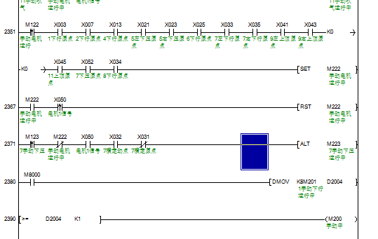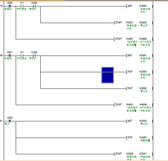 在自動狀態下按下停止鍵,根據設備情況,分成兩種。一種是完成當前動作周期后停止,但設備仍然在自動狀態下。按下啟動按鈕后繼續自動運行。另一種情況是,按下停止按鈕后,設備執行完當前動作停下,按下運行按鈕繼續執行。在這種情況下不能切換為手動狀態。一般動作簡單,流程不多的情況下采用第一種,動作復雜時采用第二種。當采用第二種時會結合復位開關復位設備狀態使用。