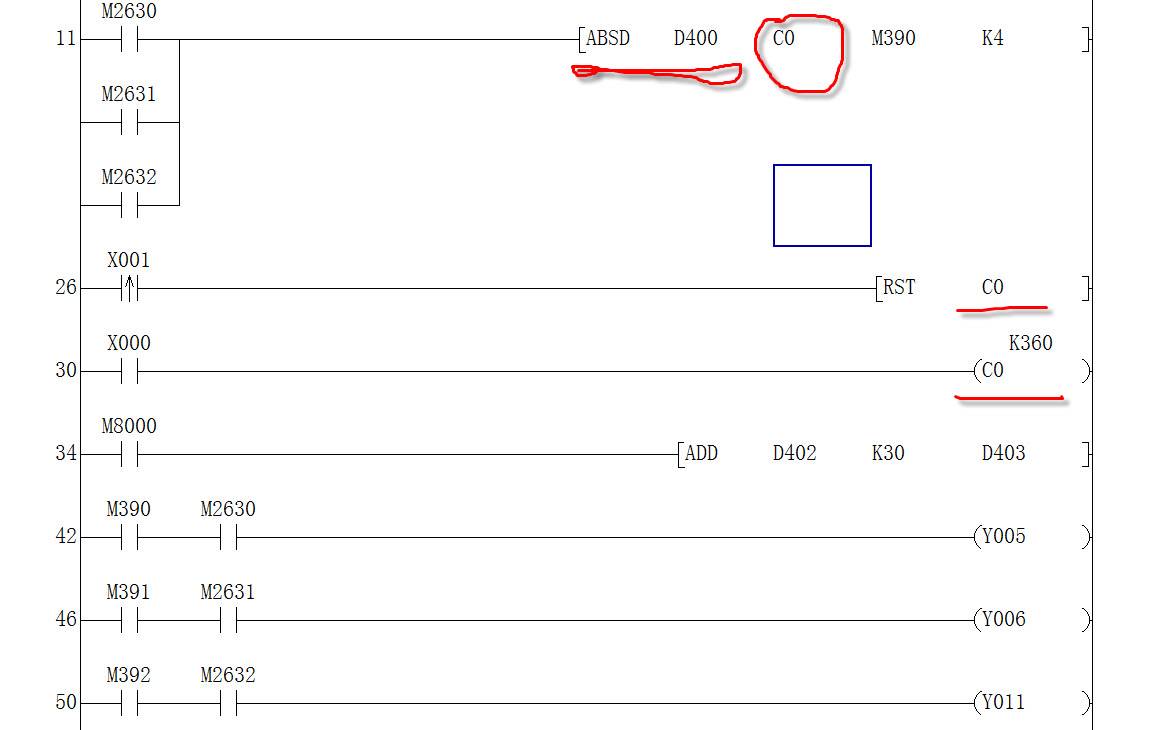 但這段程序放入一個大程序中(大約500多步),速度達到60rpm,Y5、Y6、Y11輸出一直就是ON不變了。