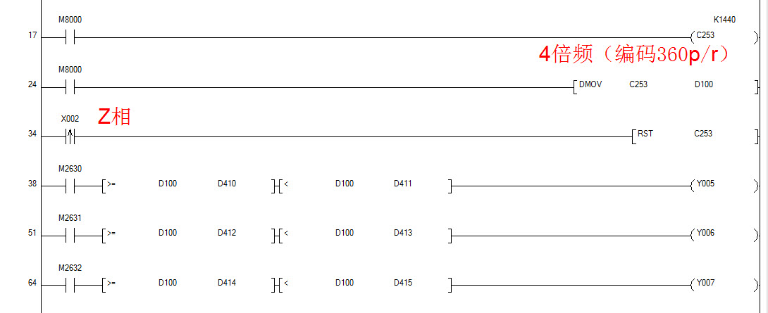 電機旋轉一周,有幾個執行機構在一定角度上動作,(如通氣、上液等)也就是需要控制各個執行機構的起止角度,程序如下圖: